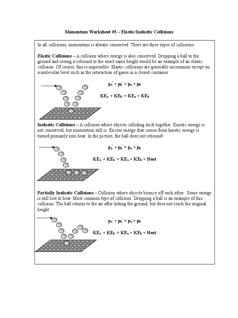 What Is The Equation For Conservation Of Energy A Perfectly Elastic Collision Tessshebaylo from docs.google.com When starting to investigate collision problems, we usually consider situations that either start or end with a single body. Collision can be classified as either elastic or inelastic. The theories behind elastic and inelastic collisions play important roles in fields such as gas kinetics, fluid mechanics, aerodynamics, mechanics and various other fields. Nov 7, 2019 12:34 ist. Elastic and inelastic collisions • different kinds of collisions produce different results. An inelastic collision, in contrast to an elastic collision, is a collision in which kinetic energy is not conserved due to the action of internal friction. In the inelastic collision, the objects stick to each other or move in the same direction. An elastic collision is one in which no kinetic energy loss occurs within the system kinetic energy can be expressed as: