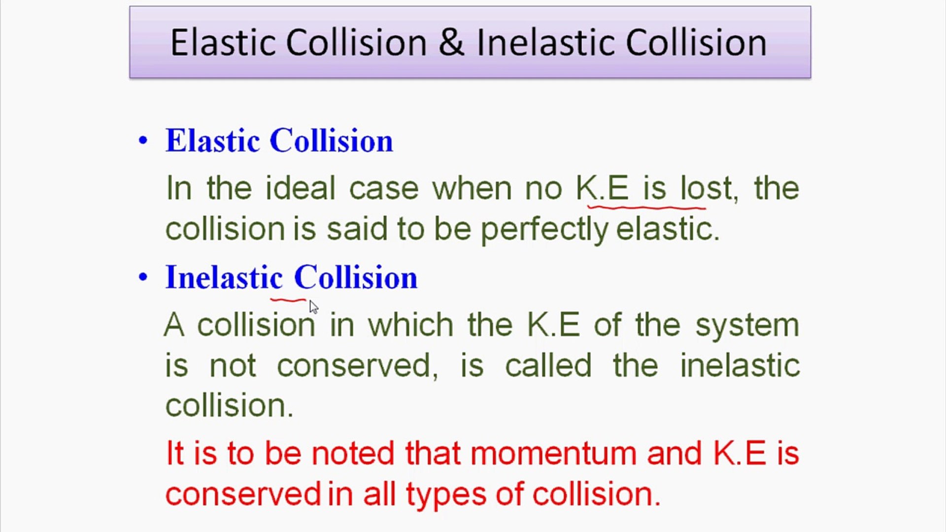 Difference between elastic and inelastic collision. In an ideal, perfectly elastic collision, there is no net conversion of kinetic energy into other forms such as heat, noise, or potential energy. Elastic collisions and inelastic collisions are the two types of collisions categorized by this energy conservation. Before we continue with inelastic collisions, let's first get into some very interesting cases of elastic collisions. But calculations comparing kinetic energy before and after the collision show kinetic energy is not conserved.